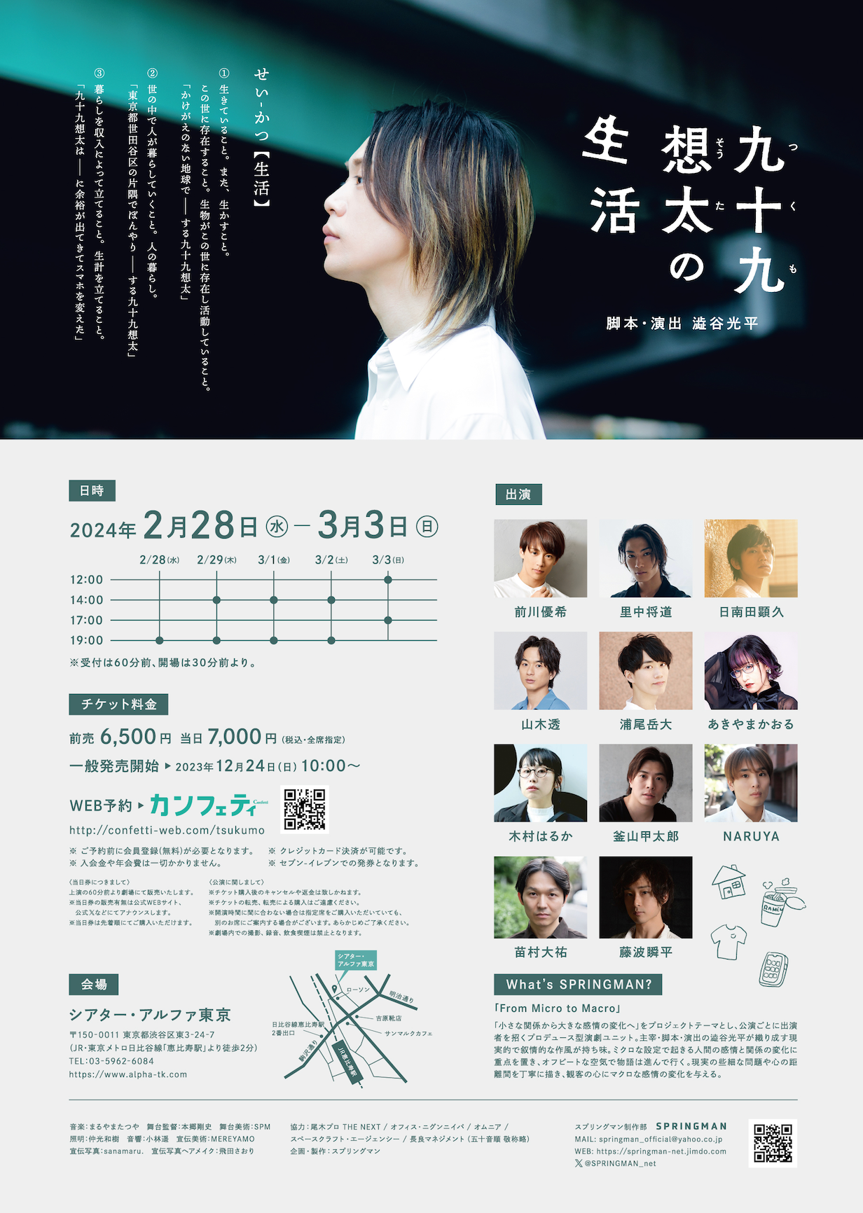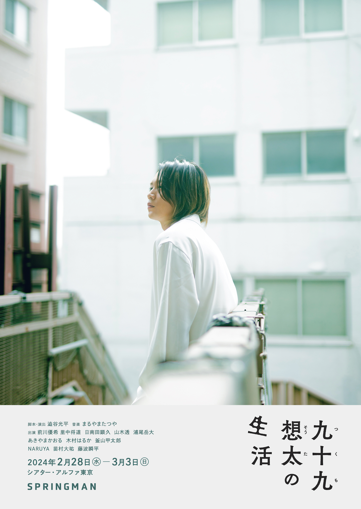 澁谷光平が主宰するプロデュース型ユニット、スプリングマンの新作舞台「九十九想太の生活」が 2024年2月28日(水)~3月3日(日)、シアター・アルファ東京にて上演される。