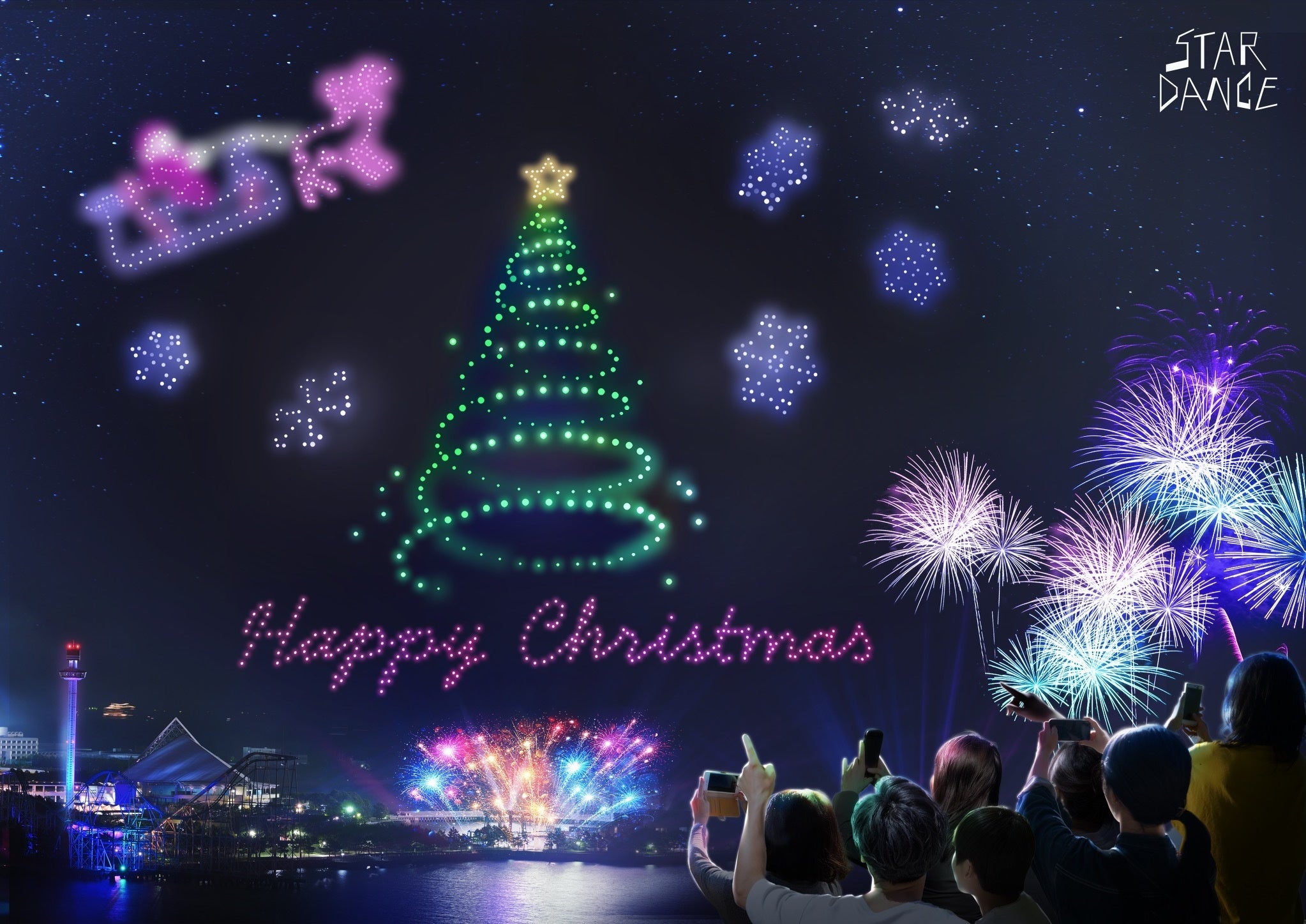 12月24日、クリスマス・イブの最終公演では、特別公演としてクリスマスをテーマとするこの日限りのドローンショーをお届けします。迫力満点の花火と、空を自由に舞うドローンショーが織りなす壮大な光のスペクタクルショー。聖なる夜の特別な思い出にぜひお楽しみください。