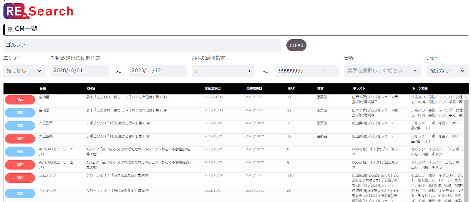 ゴルファーが出てたCM / ダンスシーンがあったCM / タレントの◯◯さんが出ていたCMなど、企業名やブランド名がわからなくても検索可能です。