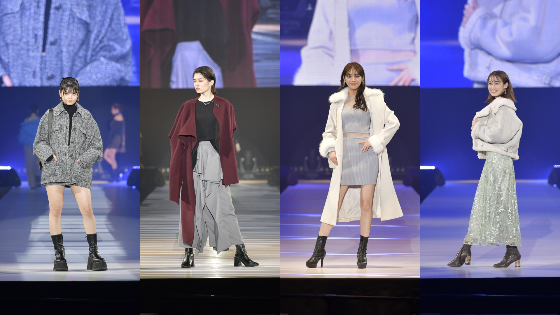 「MERCURYDUO STAGE」では、大胆な花柄のワンピースにショート丈のファーコートを合わせた新川優愛、ペールトーンのアウターやニットでコーディネートしたヘラヘラ三銃士、ミントグリーンのスカートが印象的な藤井サチらが、色鮮やかな装いでランウェイを華やかに飾りました。