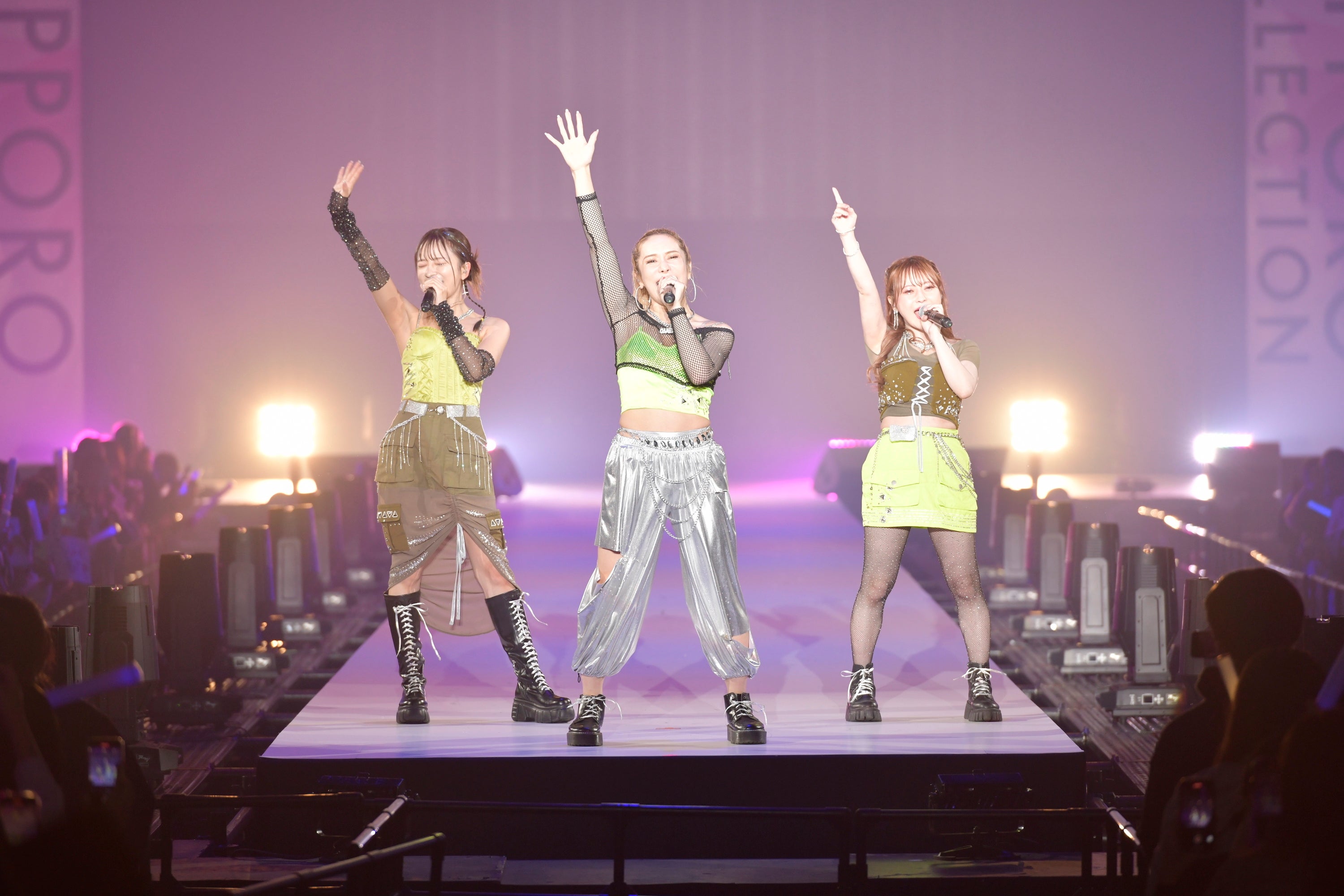 「EMODA STAGE」ではNikiがシャギーニットにフレアパンツを合わせたモードなスタイルで登場。北海道出身のぎし(ばんばんざい)とみゆ(ばんばんざい)は、それぞれブルー、ピンクを利かせたカラフルなコーディネートで地元凱旋ステージを彩り、故郷に錦を飾りました。