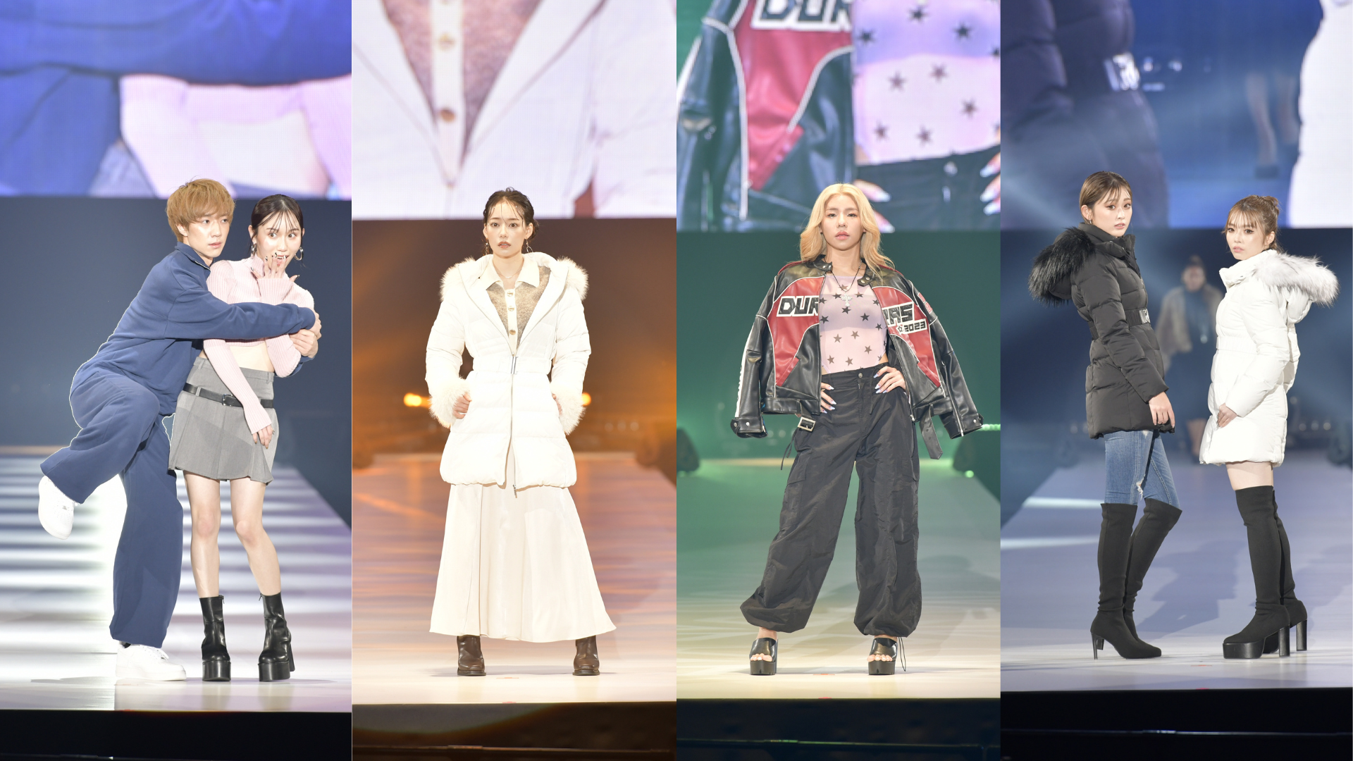 「DURAS」のファッションステージでは、肩に掛けたバイカージャケットが印象的なとうあや、ダウンジャケットからブルーのシアートップスをのぞかせた景井ひな、続いて林田真尋、PyunA.(ぴょな)、安斉星来らが登場し、メロウなBGMに合わせて秋冬のヘルシーな肌見せコーデを披露しました。