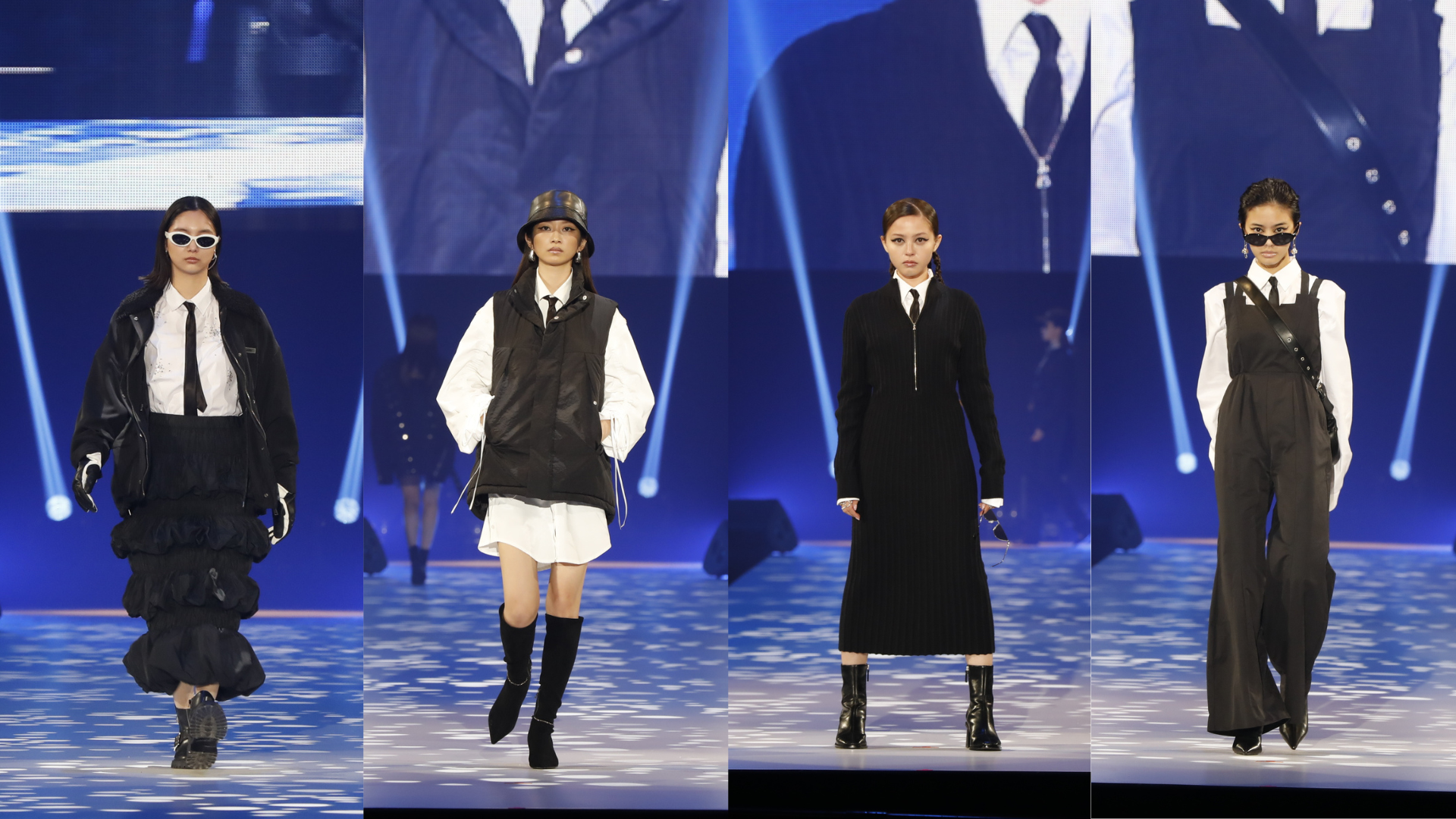 「AZUL BY MOUSSY STAGE」では、ストライプパンツにボリューム感ある中綿ベストを合わせた安斉星来がトップを飾り、アリアナさくら、米倉れいあ、香川沙耶、Nikiらがポンチョやアームウォーマー、シアーシャツを取り入れた多様なコーディネートで見事なランウェイを披露しました。