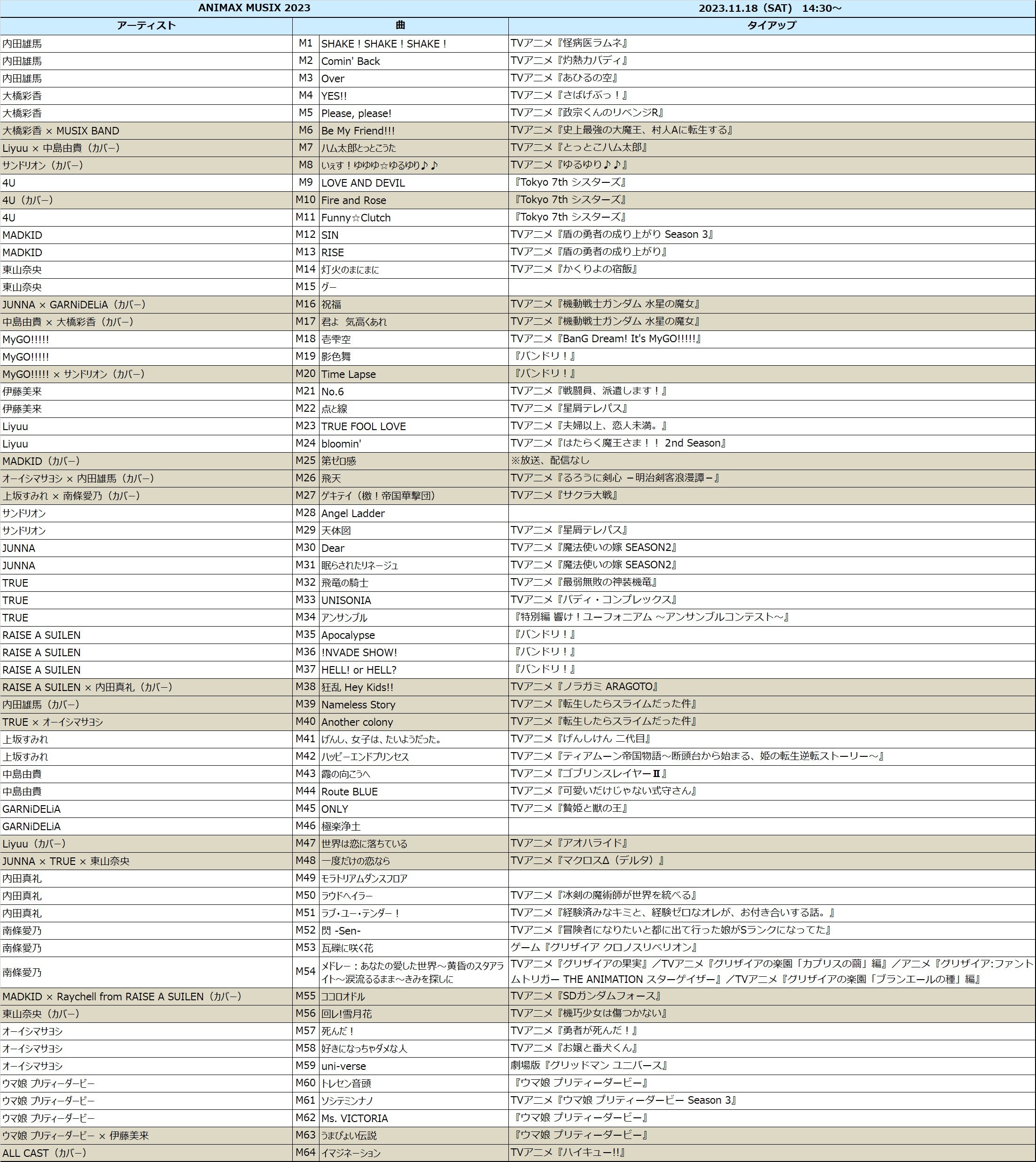伊藤美来、上坂すみれ、内田真礼、内田雄馬、ウマ娘 プリティーダービー、オーイシマサヨシ、大橋彩香、GARNiDELiA、サンドリオン、JUNNA、東山奈央、TRUE、中島由貴、南條愛乃、4U、MyGO!!!!!、MADKID、Liyuu、RAISE A SUILEN