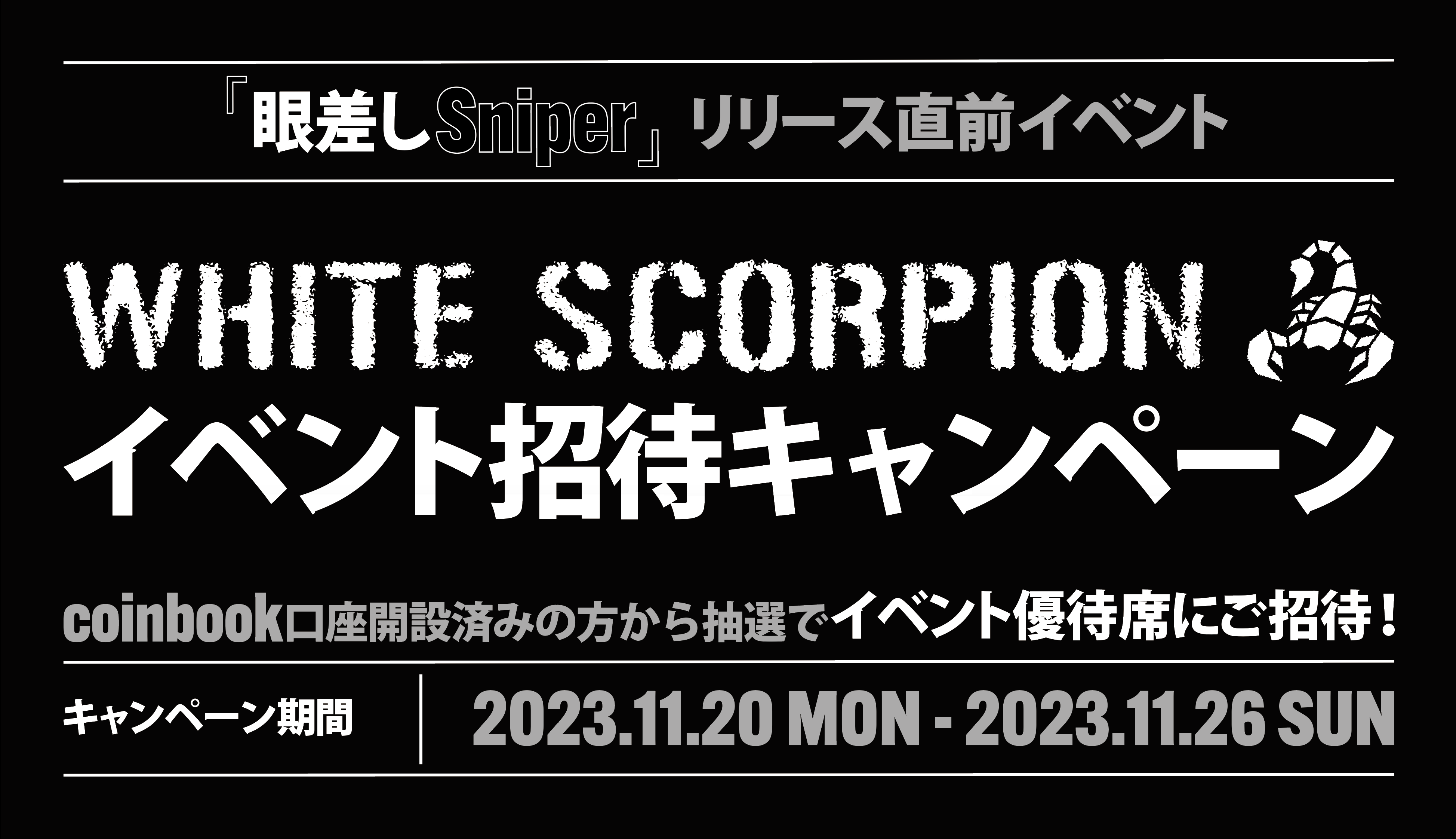株式会社coinbook(本社:東京都港区、代表取締役:大槻 正孝、以下「coinbook」)は、2023年11月20日(月)12:00より、来る2023年12月2日(土)、3日(日)に開催される「WHITE SCORPION 『眼差しSniper』リリース直前イベント supported by coinbook」の優待席とイベントオリジナルグッズが当たる抽選キャンペーンを行います。