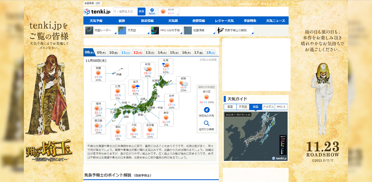 期間限定で、「tenki.jp」のトップページのデザインが、映画『翔んで埼玉 ~琵琶湖より愛をこめて~』のビジュアルを起用した特別仕様になります。
