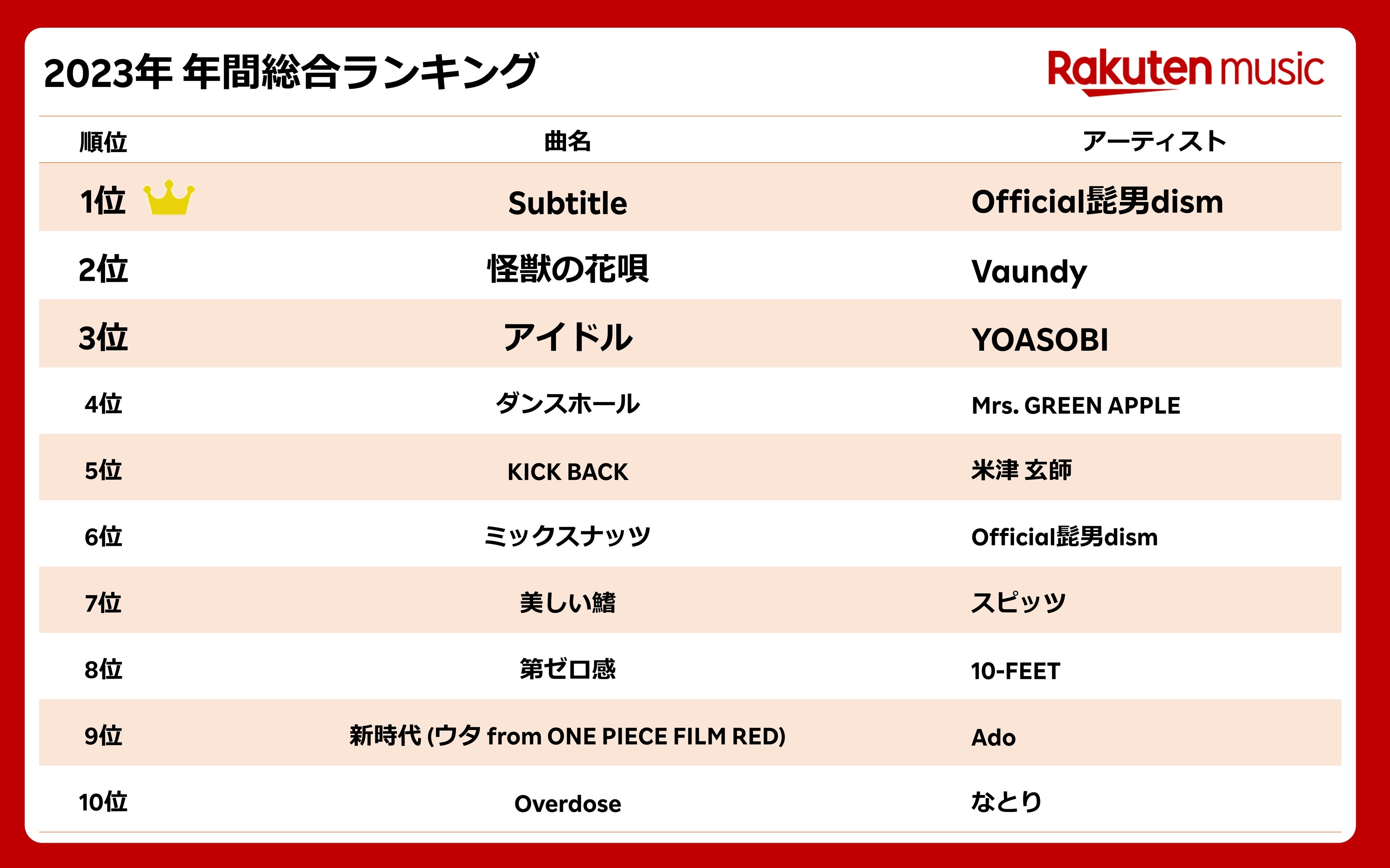 ■「Rakuten Music」2023年 年間総合ランキング