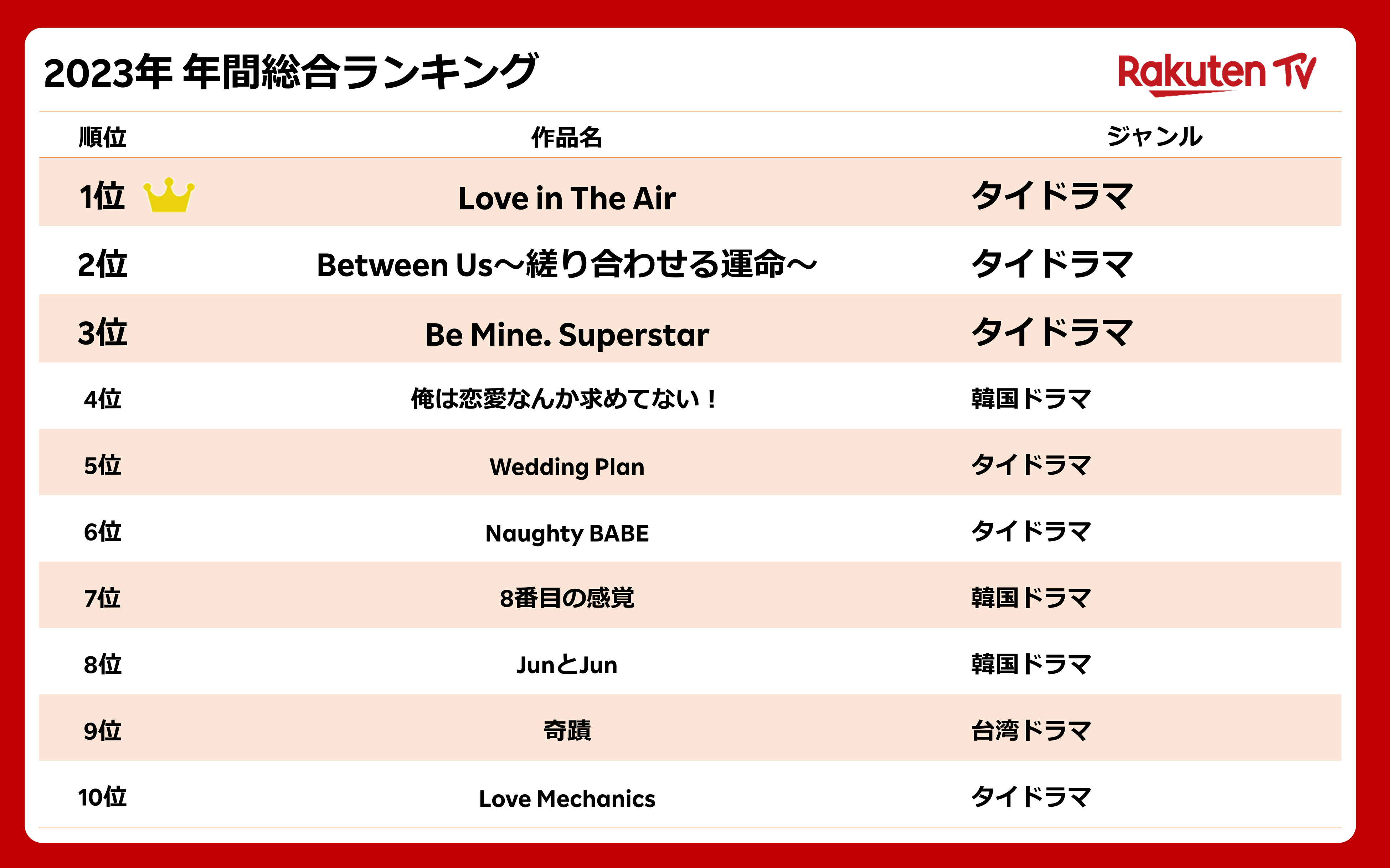 本ランキングを開始した2020年以降、タイ「BL」がトップ3を占めるのは今回が初めてです。また、トップ10のうちタイ「BL」が6作品ランクインしています。1位に輝いたのは、本年2月に配信を開始したタイ「BL」ドラマ『Love in The Air』でした。本作品はタイの「BL」ドラマの中でも高い支持を誇る脚本家のオーラワン・ウィチャヤワナクンの作品で、4人の主人公が織りなす激しくも優しいラブロマンスです。2023年の上半期ランキングでも1位を獲得し、出演俳優陣によるファンミーティングが日本(東京、大阪)と韓国で開催されるなど、アジア圏で圧倒的な人気を誇っています。「Rakuten TV」ではファンミーティングのライブ配信を実施し、多くのユーザーが視聴しました。