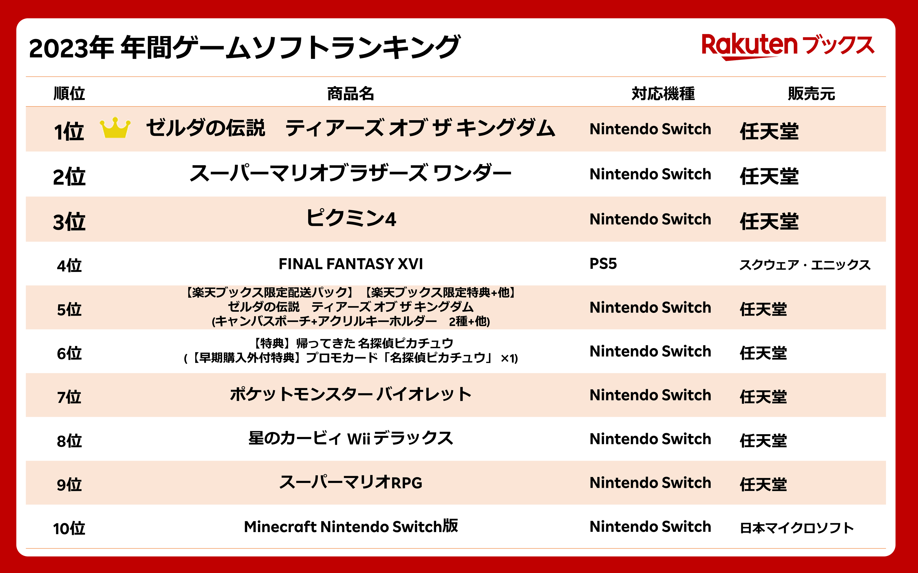 ・「楽天ブックス」2023年 年間ゲームソフトランキング