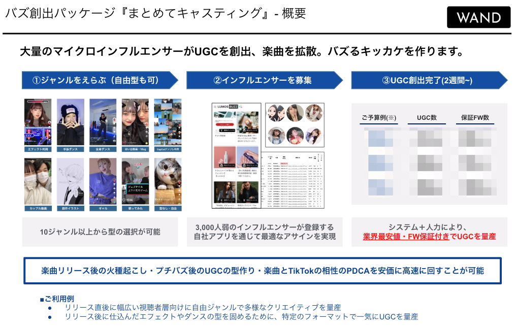 株式会社WAND(ウォンド)は、総フォロワー数1億人以上・3,500人のクリエイターが登録する国内最大級のTikTokクリエイターMCN『LUMOS(ルーモス)』(https://lumos.co.jp/)及び、TikTok UGC創出を安価に大規模に実現可能なクローズドプラットフォーム『LUMOS BUZZ』を運営するインフルエンサーマーケティング企業です。