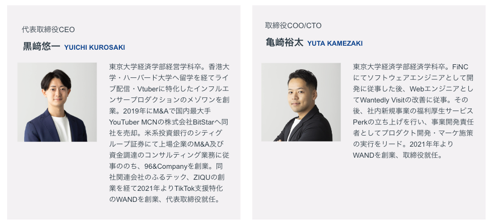 東京大学経済学部卒。香港大学・ハーバ ード大学へ留学を経てライブ配信・ Vtuberに特化したインフルエンサープロ ダクション及び広告代理店のメゾワンを創業。2019年にM&Aで株式会社BitStarへ同社を売却。外資系投資銀行にて上場 企業のM&A及び資金調達のコンサルティング業務に従事ののち、96&Companyを創業。同社関連会社の立ち上げを行った後、2021年よりTikTok支援に特化した WANDを創業、代表取締役就任。