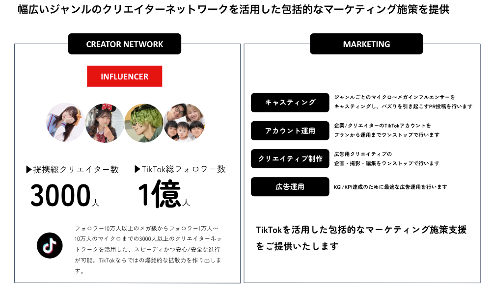 クリエイターを直接囲っているため、様々なジャンルで、すぐにインフルエンサーを起用可能です。