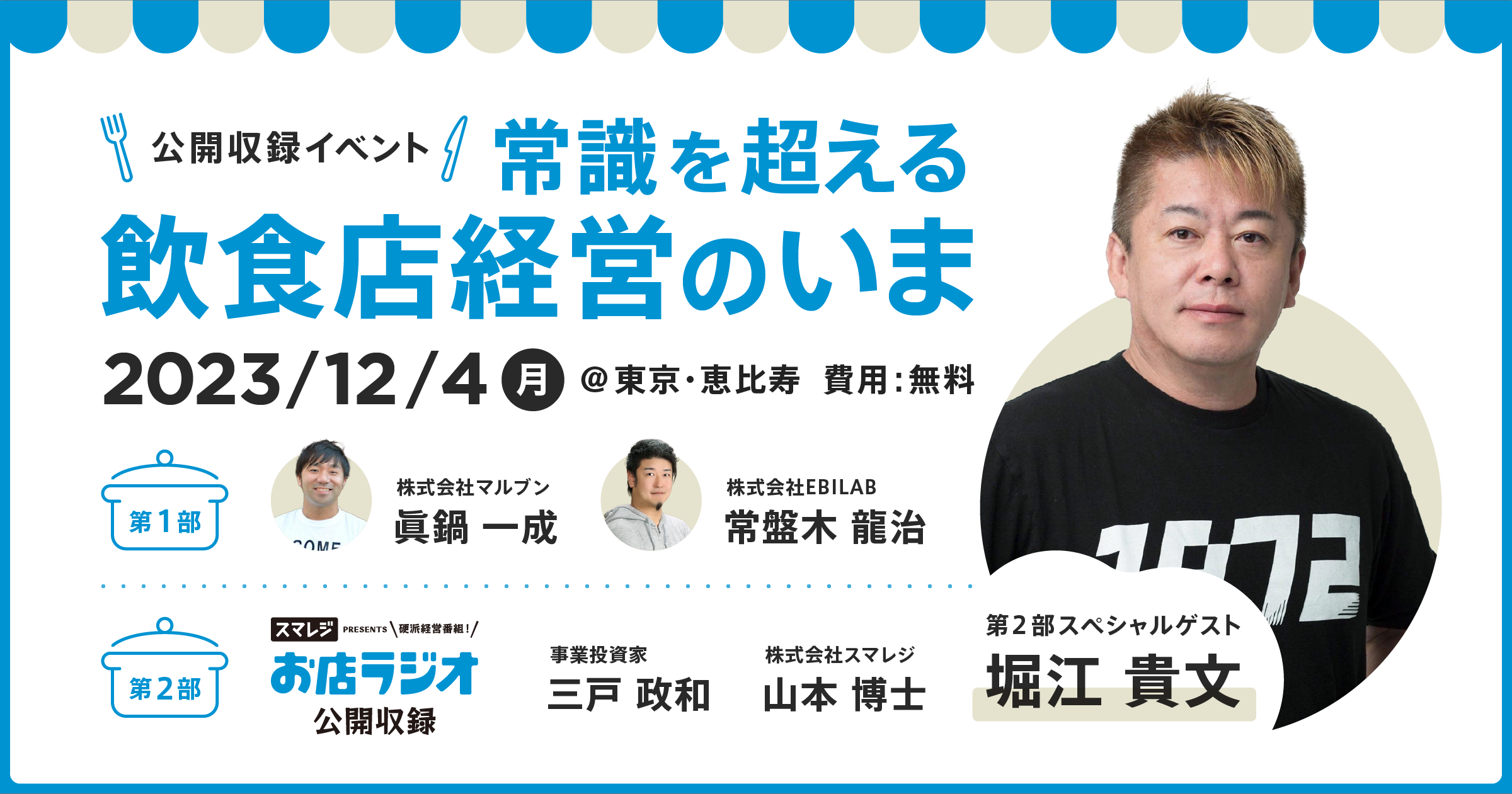 スペシャルゲストは堀江貴文氏。「常識を超える飲食店のいま。」をテーマに、スマレジユーザーの店舗経営者トークセッションと、お店ラジオ公開収録の2部制でお届けします。今までの常識にとらわれずに飲食店を運営する方々をお招きして、実際の経験を通じて経営哲学や考えをお届けするオフラインの集い。きっとお店づくりのヒントが見つかるはずです。参加は無料。是非ご参加ください。