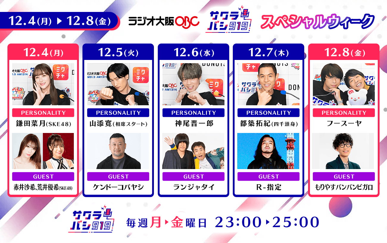 各パーソナリティーが、好きな分野を熱量高く語る番組で、2年目を迎えた今年4月より、月曜から木曜はミクチャスタジオ(東京)、金曜は「サクラバシ919 WEEKEND STYLE」としてラジオ大阪本社スタジオから、それぞれ生放送でお届けしています。