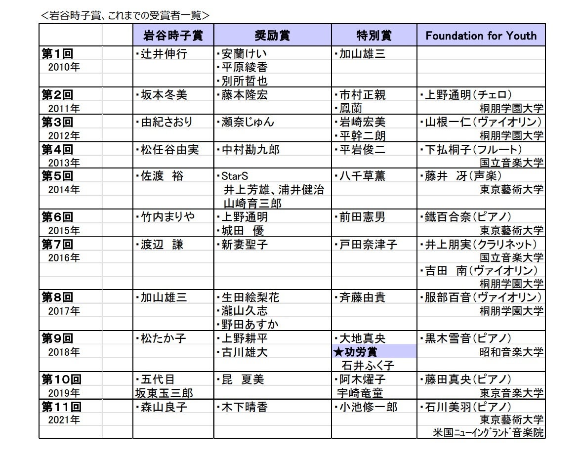 岩谷時子賞に市村正親様(俳優)、岩谷時子賞特別賞に渡辺貞夫郎様(音楽家) 、岩谷時子賞奨励賞に知念里奈 様(歌手・俳優)、岩谷時子 Foundation for Youth」に平石英心リチャード様(ヴァイオリニスト)を選出いたしました。
