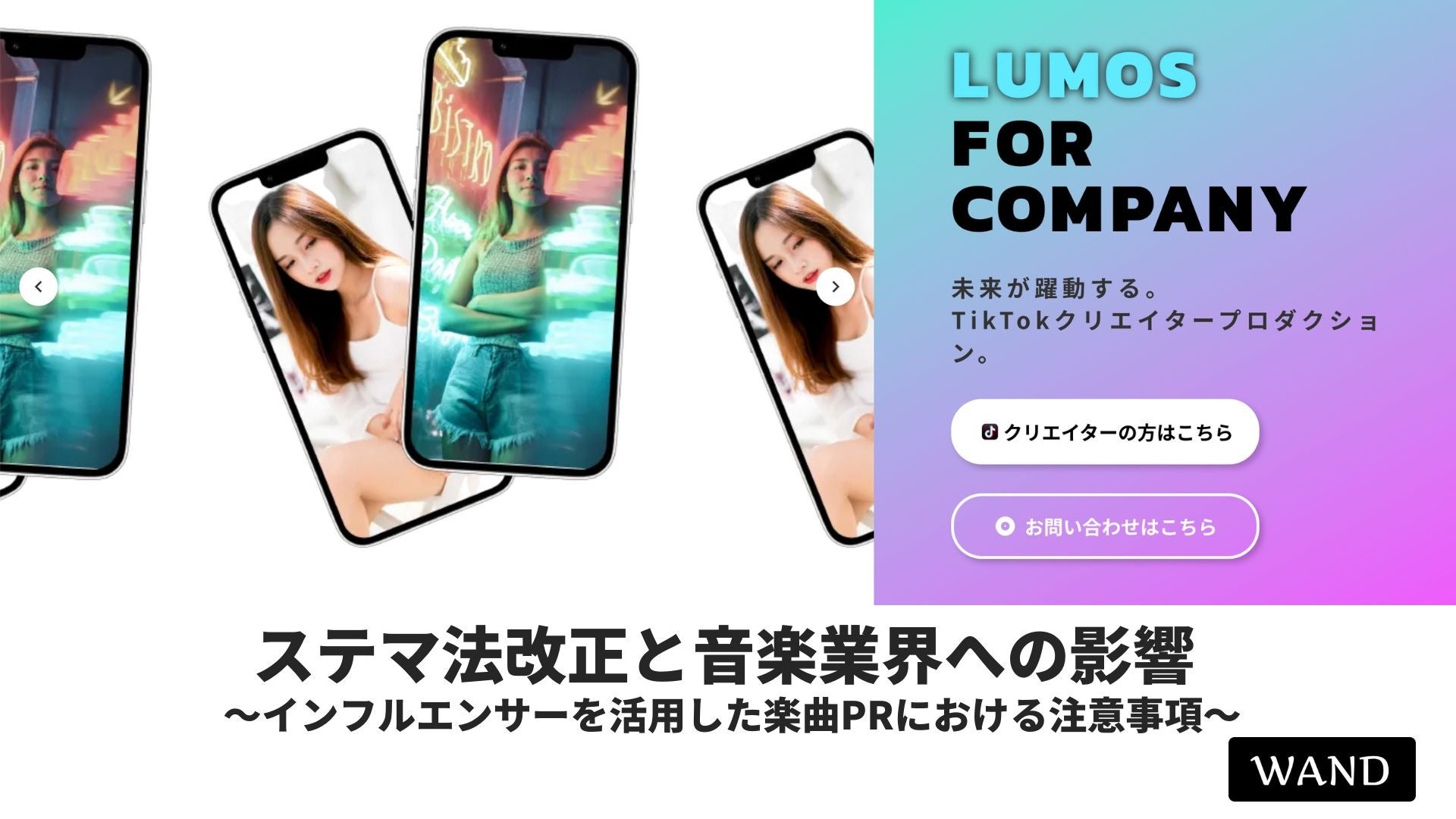 総フォロワー数1億人以上・3,500人のクリエイターが登録する国内最大級のTikTokクリエイターMCN『LUMOS(ルーモス)』(https://lumos.co.jp/)及び、TikTok UGC創出を安価に大規模に実現可能なクローズドプラットフォーム『LUMOS BUZZ』を運営する株式会社WAND(ウォンド)は、【ステマ法改正と音楽業界への影響】に関する資料を無料で公開しました。