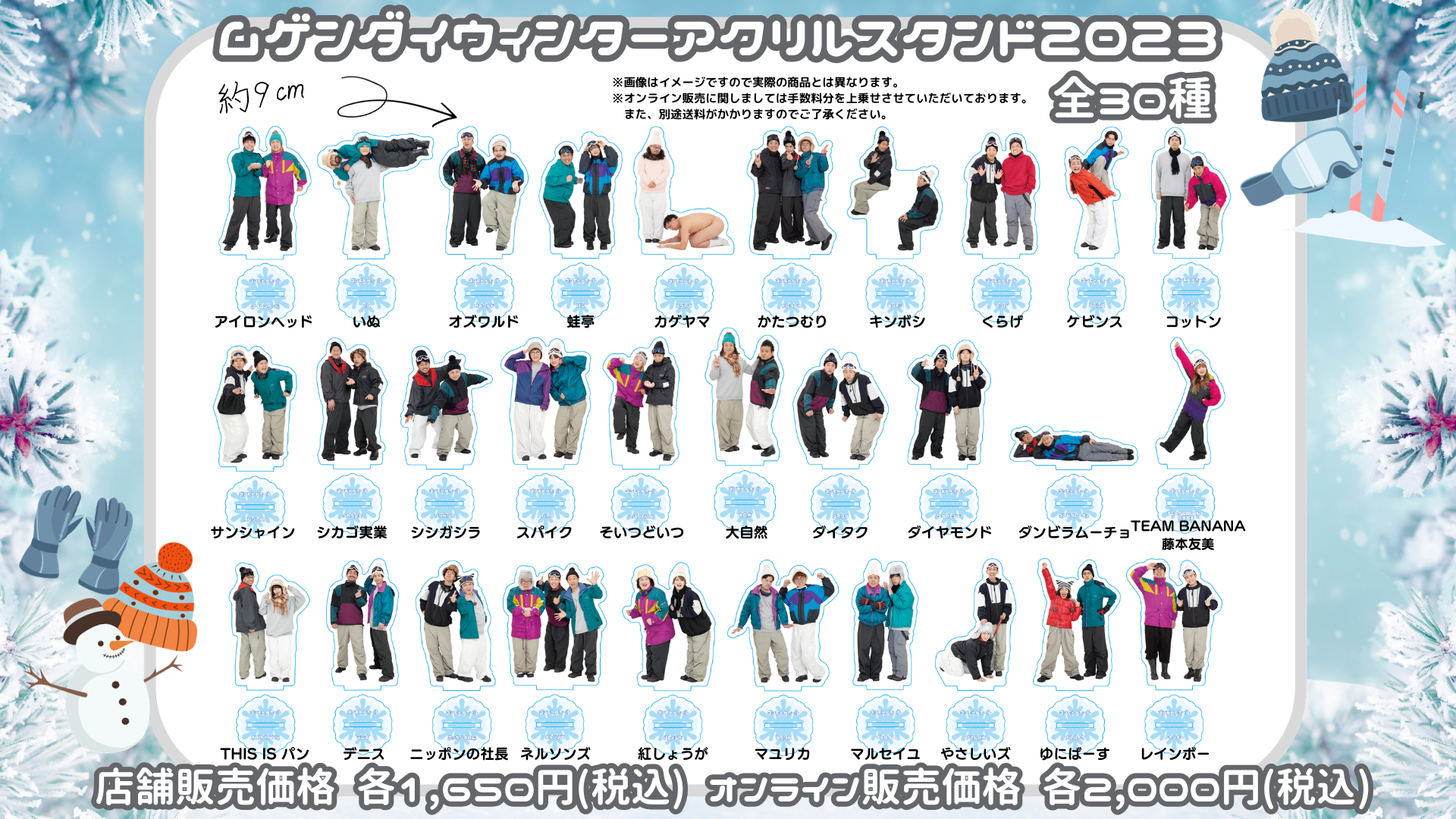 2023年12月1日(金)~12月31日(日)には、冬のキャンペーン『MUGENDAI WINTER’23』を開催。本キャンペーンでは、ムゲンダイレギュラーがスキーウェア姿となったロビーポスター装飾をはじめ、前回の浴衣アクスタに続き、季節感あふれる冬ならではのウィンターアクリルスタンドとオリジナルフォト、ウィンターステッカーの販売を行います。