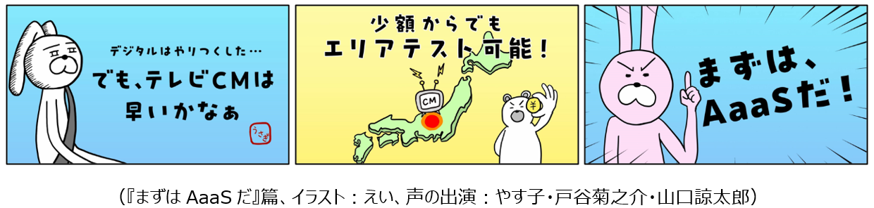 「テレビCMはまだ早いかなあ…」と悩みを抱えるウサギ社長に、少額からでもエリアテストが可能な「テレビCMトライアルパッケージ」が紹介され、ウサギが「やってみよう」と決意を固める『まずはAaaSだ』篇ほか3篇を放映します。