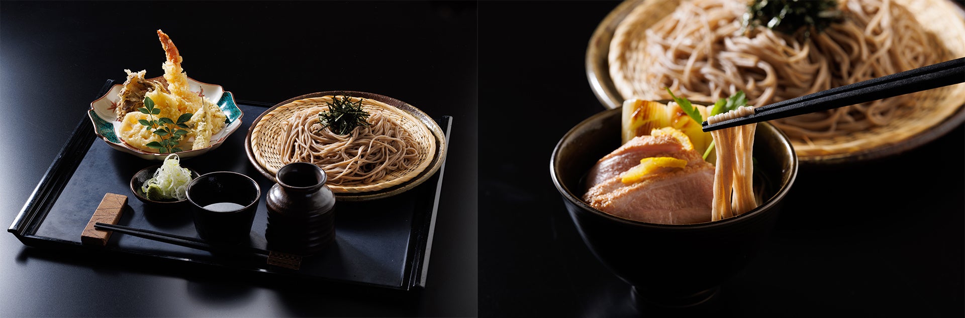 鴨肉の旨味と香りが堪能できる鴨南蛮と、旬の食材を使った天ぷらをご用意しております。
