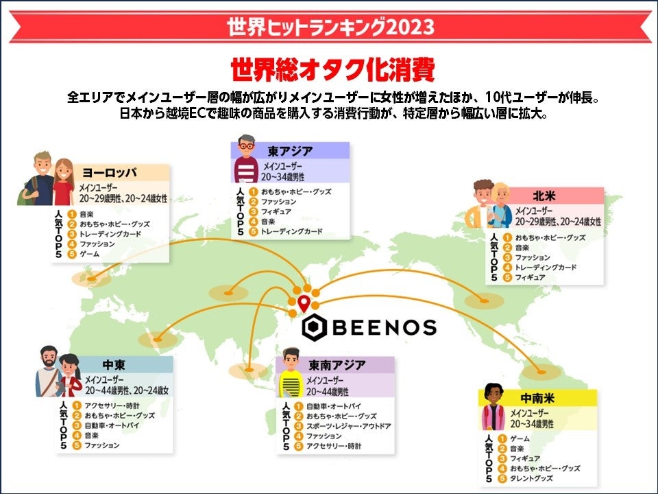 2023年のヒットランキング、伸長ランキングでは、「おもちゃ・ホビー・グッズ」「音楽」「ファッション」「フィギュア」など、越境ECの人気カテゴリが並びました。一見すると大きな変化がないように見えますが、「購入者」に目を移すと全世界的に若年層や女性ユーザーの数が増加傾向にあります。2022年以来の円安傾向が続いていることから、日本の商品を購入しやすい環境だったことが後押しとなり、これまで30代以上の男性に特に強く表れていた趣味的消費傾向が全世界的に幅広い層に拡大しました。「世界総オタク化」により、アニメ、ホビー、ガジェットなど、全世界の様々な「オタク趣味」に応える日本の越境EC市場が拡大しています。