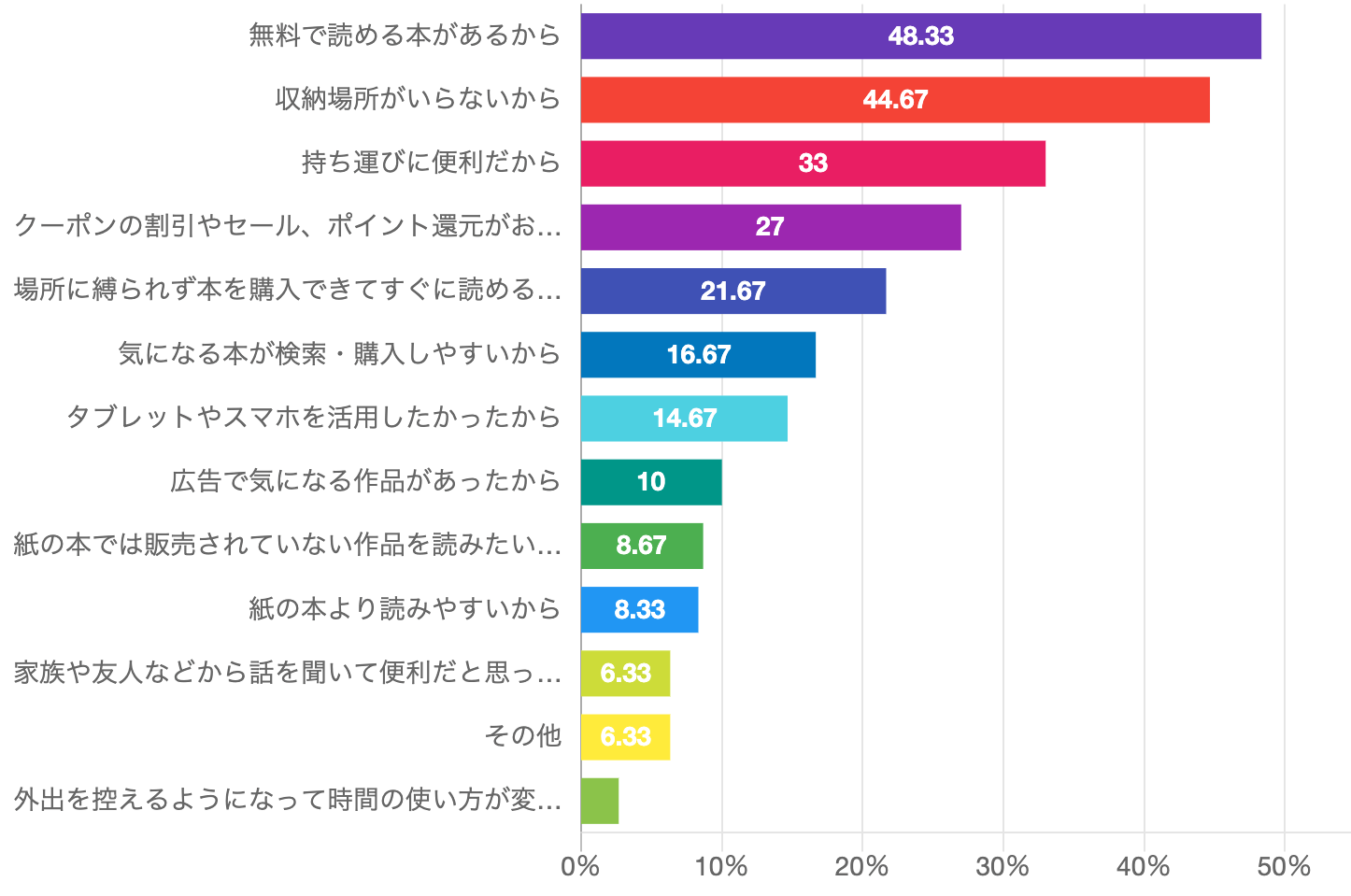 電子書籍を利用する理由についてのアンケート(複数回答可)では、48.33%の方が『無料で読める本があるから』という理由で電子書籍を利用していることがわかりました。