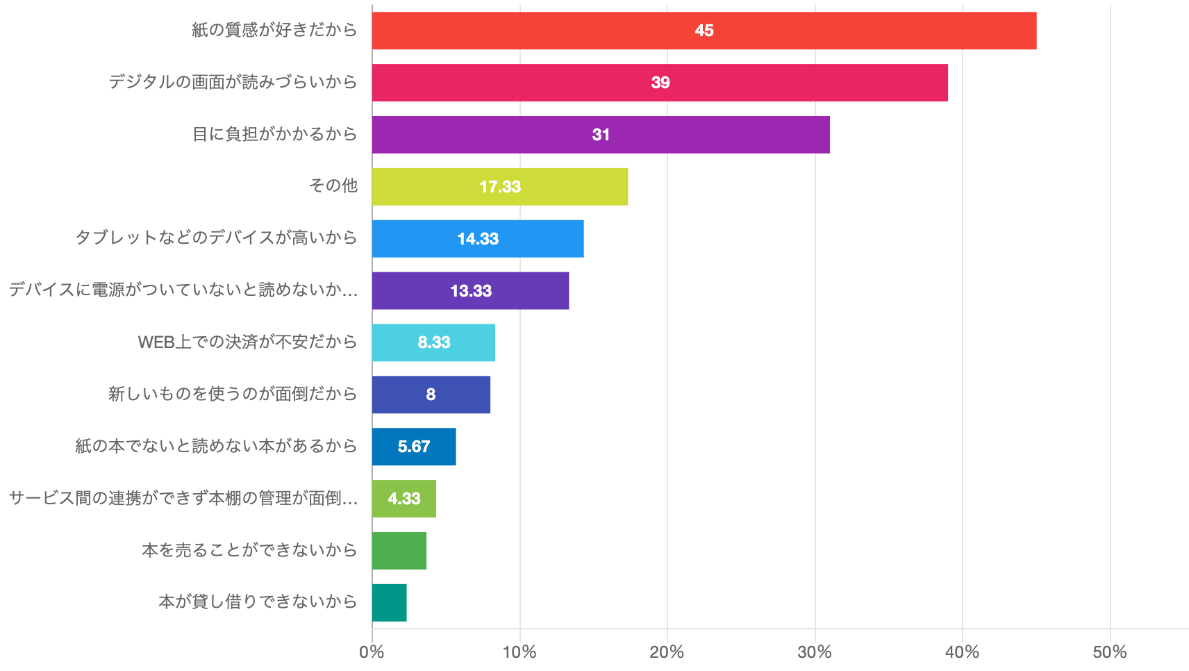 1位の『紙の質感が好きだから』は45%と半数に近い回答があり、紙の本に対する根強い人気を感じさせます。