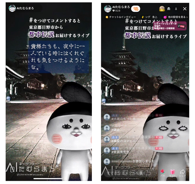 2023年11月13日、TikTok上で「AIたむらまろ」が視聴者からのコメントに双方向でコミュニケーションをするTikTokライブを開催。初の公開実証実験を実施いたしました。# (ハッシュタグ)をつけて参加者がコメントを送ると、そのコメントをテーマに、AIが生成した都市伝説を語ってくれるというインタラクティブな会話を楽しめる配信となりました。