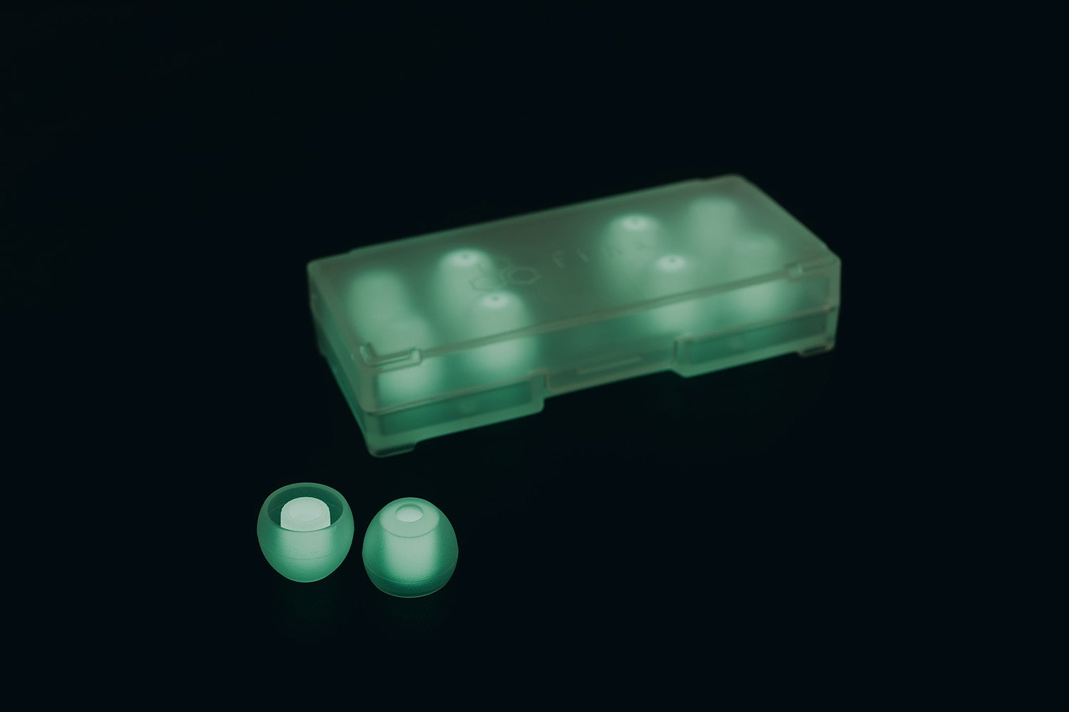 音導管部分と耳に触れる部分で硬度が異なる2種類のシリコン素材を使用しています。音導管部分には耳に触れる部分より硬度が高いシリコンを採用し、溝加工によって強度と柔軟性を両立しました。耳に触れる部分には柔らかいシリコンを使用し、快適な装着感と高い遮音性を実現しています。さらに、傘はクリア、軸の部分は暗闇で光る蓄光タイプを採用した特別仕様となっています。
