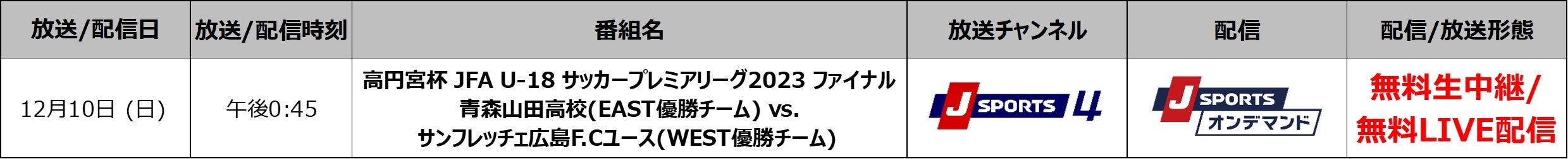 Jリーグチームを中心とするクラブチームのU-18世代と高校サッカーの強豪校による、高校生年代最高峰のリーグ戦がいよいよ決着を迎えます。 「高円宮杯 JFA U-18 サッカープレミアリーグ2023 ファイナル」は、最終節までもつれ込む激戦を制した、EAST優勝チームの青森山田高校(青森県)とWEST優勝チームのサンフレッチェ広島F.Cユース(広島県)が高校年代“真の日本一”の座をかけて対戦します。