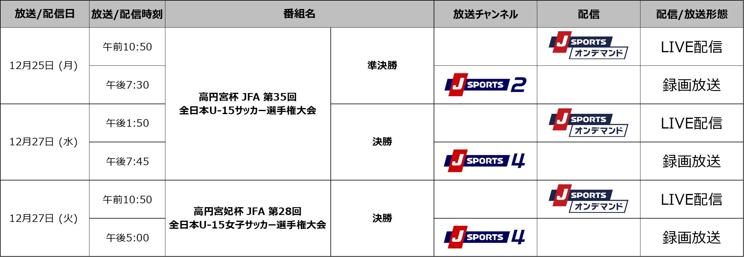 さらに、全国の男子中学生年代日本一を決める「高円宮杯 JFA 第35回全日本U-15サッカー選手権大会」の準決勝及び決勝と、全国の女子中学生年代日本一を決める「高円宮妃杯 JFA 第28回全日本U-15女子サッカー選手権大会」の決勝も放送・配信いたします。男子準決勝は12月25日(月)、男子・女子の決勝は12月27日(水)に開催され、J SPORTSオンデマンドで先行LIVE配信いたします。
