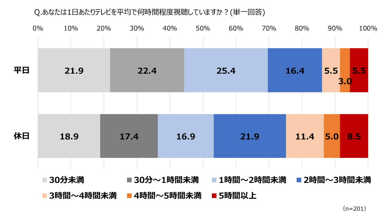 平日/休日ともに約4割が「1日あたりのテレビ視聴1時間未満」と回答