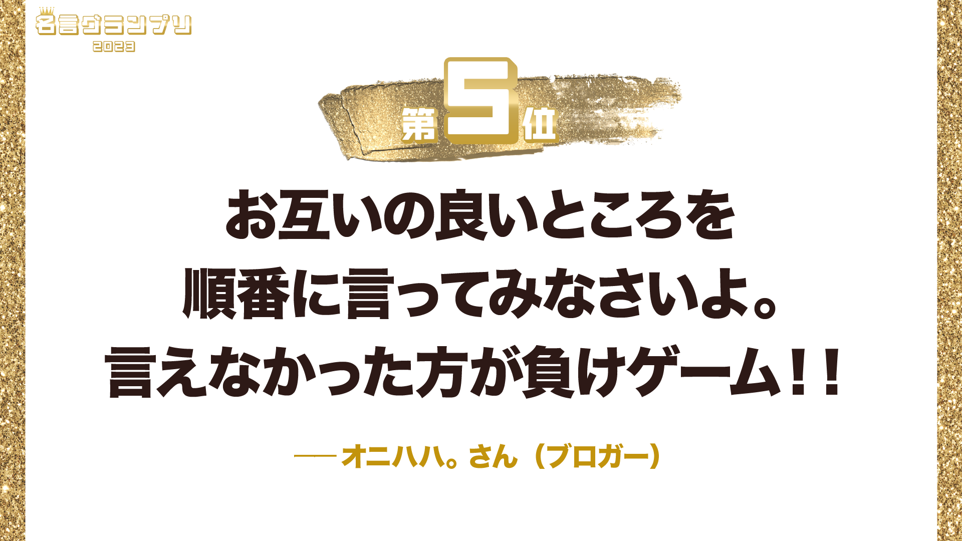 お互いの良いところを順番に言ってみなさいよ。言えなかった方が負けゲーム!! ―オニハハ。さん(ブロガー) |