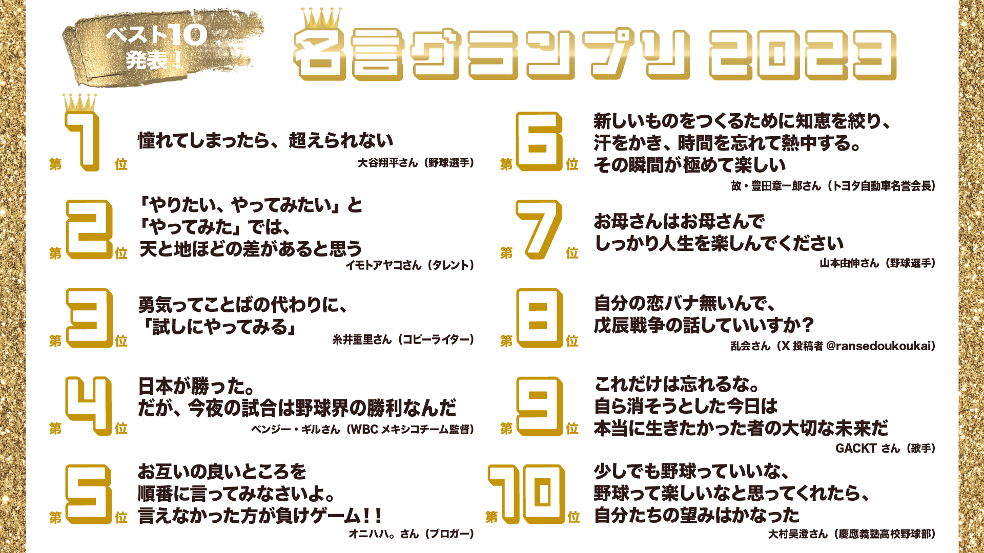 「『今年もあっという間だったな』、そんな会話が多く聞こえる年の瀬。本格的なコロナ禍明けを迎えた2023年、WBCの日本優勝といった明るいニュースがあった一方で、言葉によって人が傷つけ合うような、誹謗中傷のニュースもありました。でも実は、こんなにもたくさんの名言が生まれていたことに気付かされます。