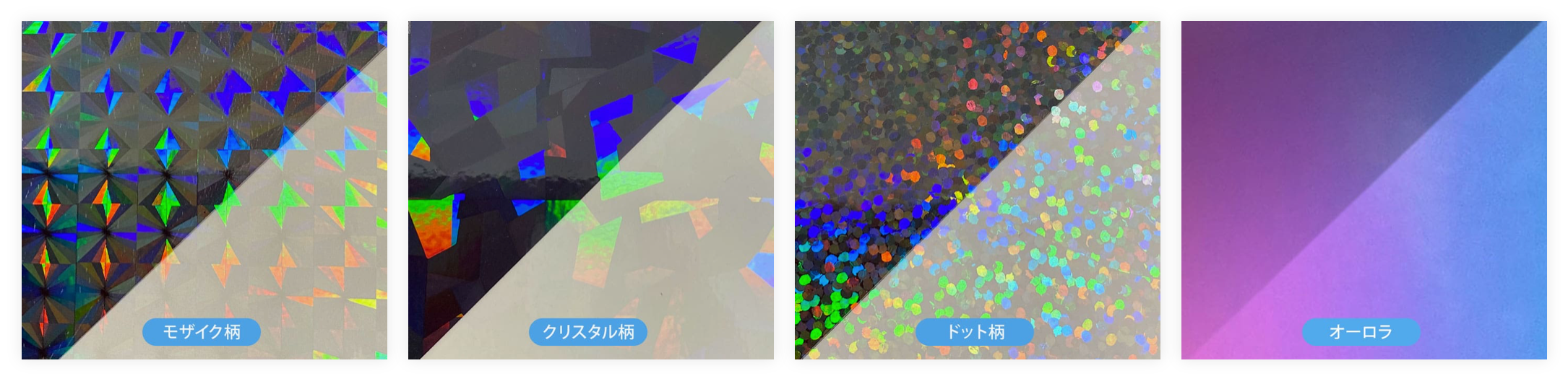 オーロラ柄、モザイク柄(ビックリマンチョコシール風)、クリスタル柄、ドット柄の4種類からお選びいただけます。