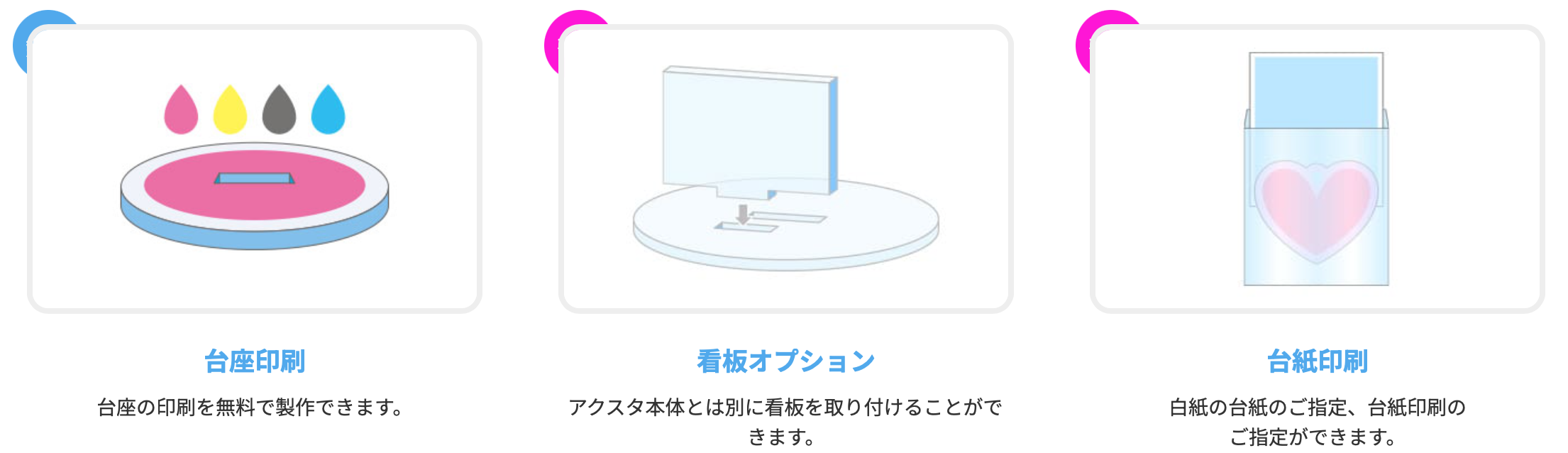 幅広いカスタマイズができ、特に台座への印刷を無料で行うサービスが好評で、法人様向けの売掛販売も可能です。