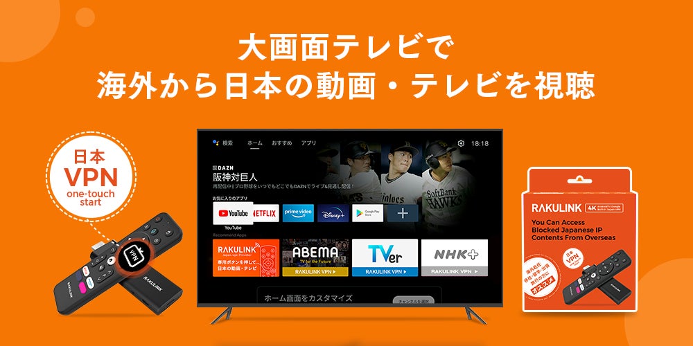 「ATV Stick S20」は、海外からアクセスした場合に制限のかかる日本の動画・テレビサービスを視聴するための『日本VPN搭載AndroidTV Dongle』です。RAKULINKという動画視聴のために開発された日本VPNサービスを搭載し、リモコンの専用ボタンを押すだけで、日本VPNが簡単に起動します。