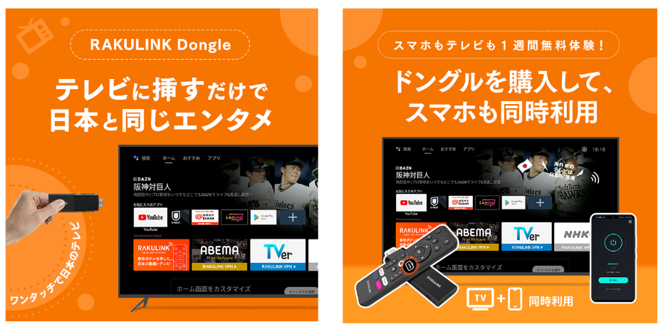 「ATV Stick S20」は、海外からアクセスした場合に制限のかかる日本の動画・テレビサービスを視聴するための『日本VPN搭載AndroidTV Dongle』です。RAKULINKという動画視聴のために開発された日本VPNサービスを搭載し、リモコンの専用ボタンを押すだけで、日本VPNが簡単に起動します。