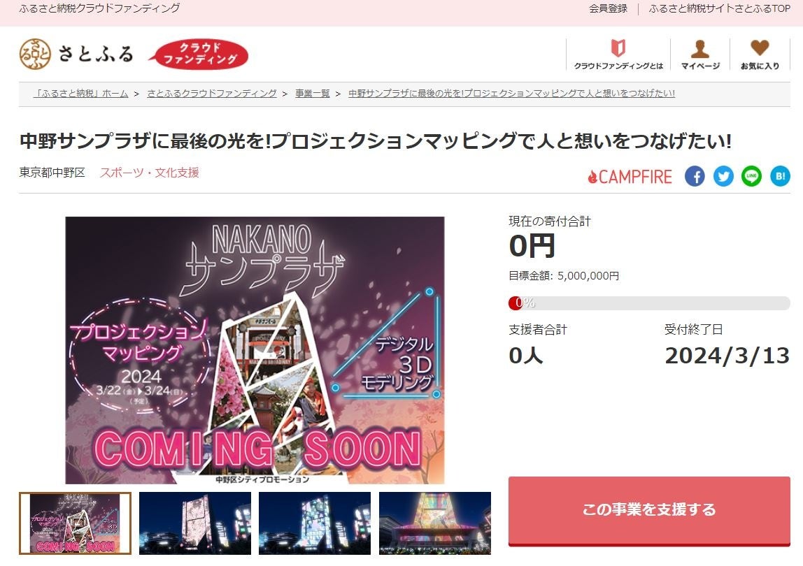 この度は「中野サンプラザプロジェクションマッピング」に関心をお持ちいただき誠にありがとうございます。開館から50年余りの歴史を有する中野サンプラザにおいて、唯一無二の機会を活用したプロジェクションマッピングを実施することで中野サンプラザの存在と功績を、レガシーとして未来に引き継いでいきたいと思っております。誰もが身近に文化芸術を触れられるまちにしていくためにも、皆さまの温かいご支援、ご協力をどうぞよろしくお願いいたします。