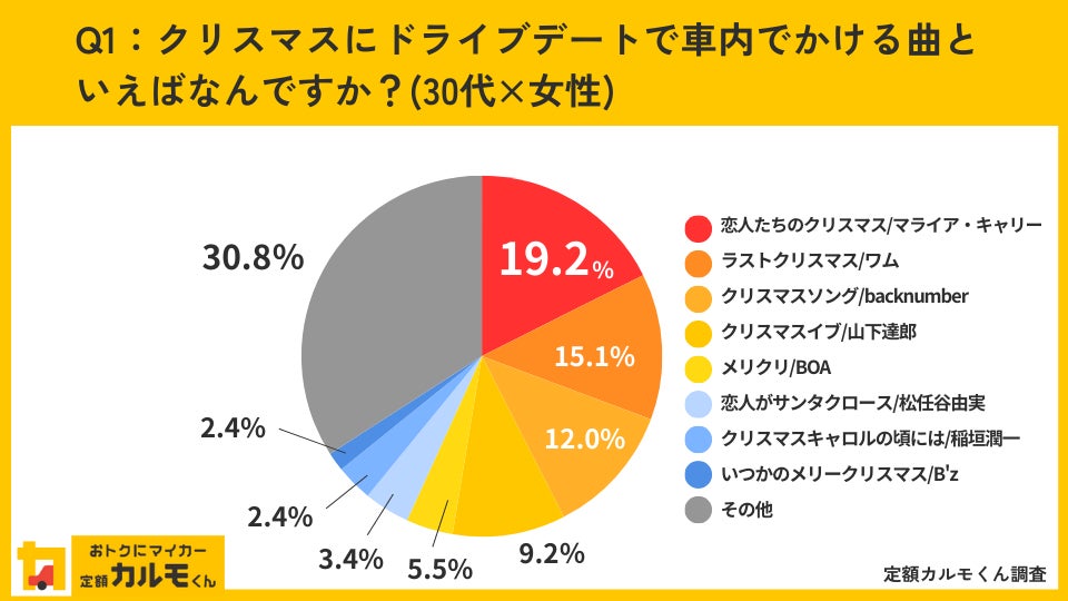 今回の調査により、クリスマスのドライブデートでかけたい曲は、20代と30代で異なることがわかりました。一方、世代を通して人気の曲には洋楽が多く、クリスマスの定番ソングとして浸透しているようです。