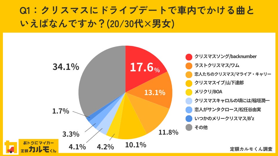 クリスマスにドライブデートで車内でかけたい曲について聞いたところ、1位は「クリスマスソング/backnumber」で17.6%でした。続いて2位は「ラストクリスマス/ワム」で13.1%、3位は「恋人たちのクリスマス/マライア・キャリー」で11.8%でした。
