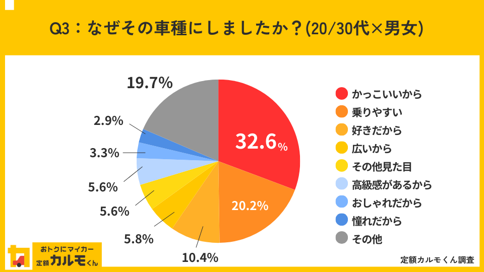 続いて、なぜその車種を選んだのか理由を聞いたところ、最も多かったのは「かっこいいから」で32.6%でした。具体的には「大人っぽいから」「SUVでかっこいいから」といった理由が挙げられました。多かったは「乗りやすい」で20.2%でした。「安定感があるから」「運転しやすいから」といった意見が多く、普段乗り慣れている車でドライブデートしたいと考えている人が多いようです。世代別でみても、上位の理由に大きな差はみられませんでした。