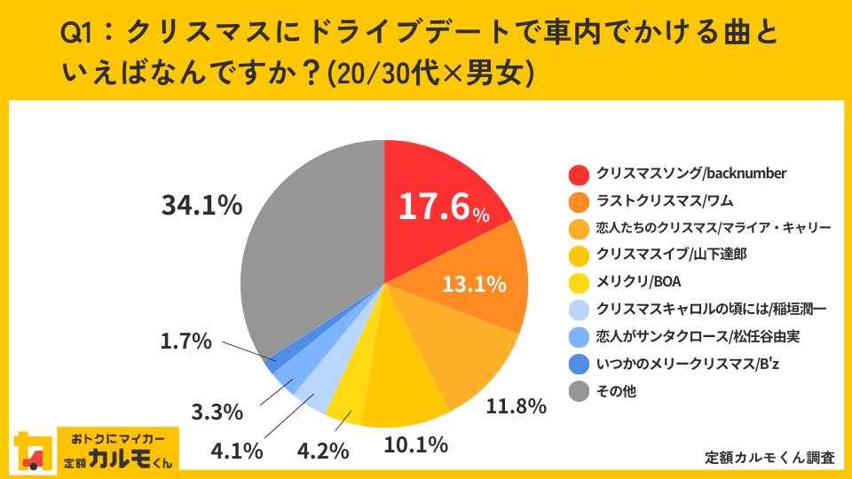 クリスマスにドライブデートで車内でかけたい曲について聞いたところ、1位は「クリスマスソング/backnumber」で17.6%でした。続いて2位は「ラストクリスマス/ワム」で13.1%、3位は「恋人たちのクリスマス/マライア・キャリー」で11.8%でした。