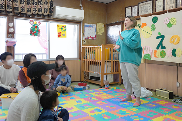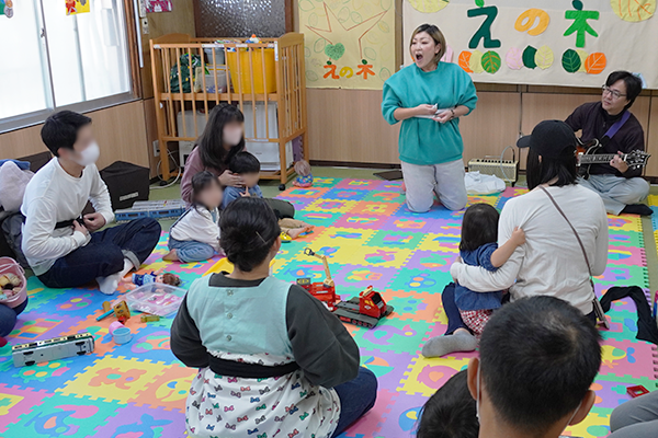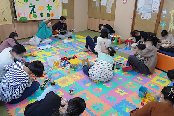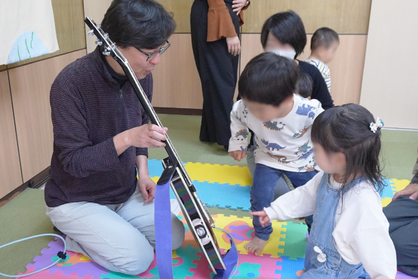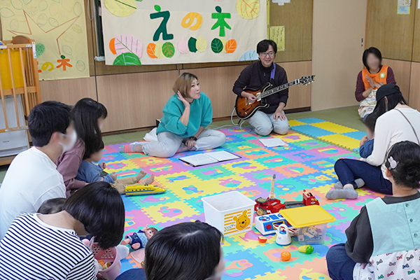 パパやママの動きに合わせて、一緒に身体を動かす子や、ギターに興味をもって触ってみる子など、子どもたちも一緒に楽しんでいる様子でした。
