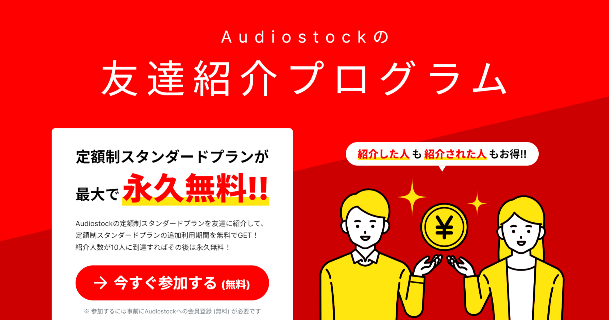 これまで、Audiostockではインフルエンサー向けの「アフィリエイトプログラム」において紹介人数に応じた報酬を付与する仕組みを提供してまいりましたが、この度、より定額制プランの利用に特化した紹介プログラムとして「友達紹介プログラム」を開始することとなりました。(※)当社は今後も、クリエイターの持続的な創作活動をサポートするため、Audiostockにおいて音源を利用しやすい仕組み作りを進めてまいります。