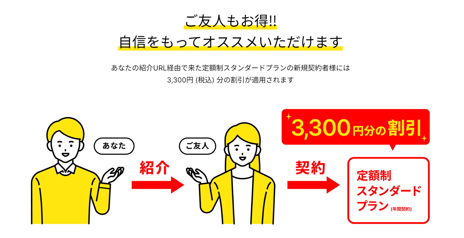 また「友達紹介プログラム」によって定額制スタンダードプランを紹介された人も、本契約時に3,300円の割引が適用される仕組みとなっているため、紹介した本人と、紹介された人の両者がお得にプランをご利用いただけます。