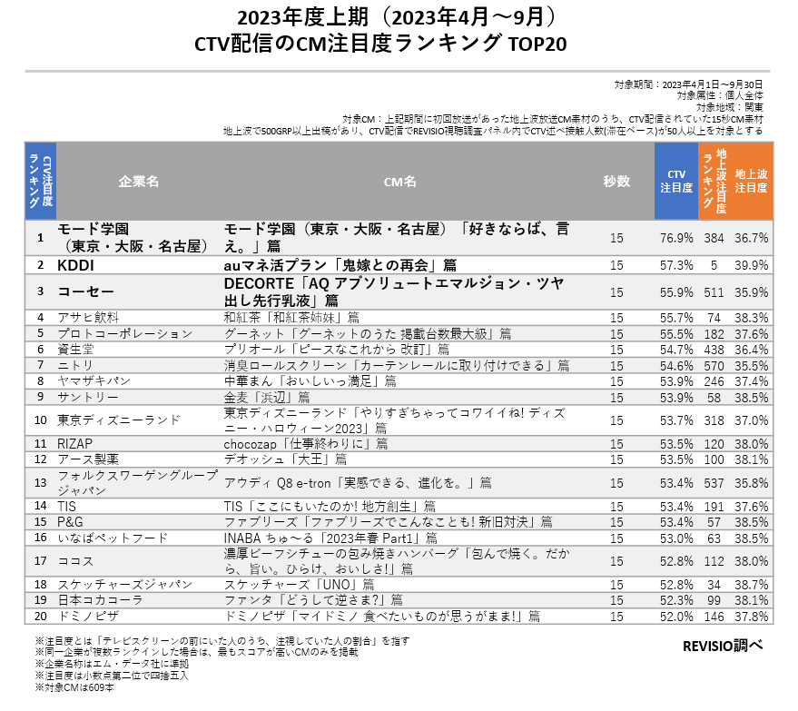 REVISIOは、 2023年4月から9月の期間で、コネクテッドTV(以下、CTV)で配信されたCM素材を対象に、視聴者の視線をくぎづけにしたCM注目度ランキングTOP20を公開しました。