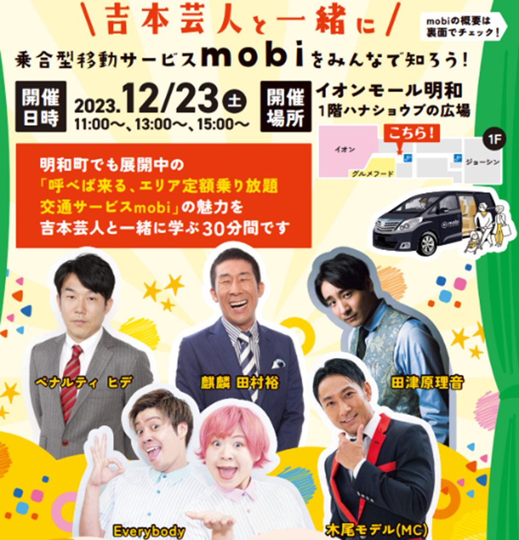 また、明和町エリアにおいては、「すゑひろがりず」が地域の方も知らないディープな明和町の雅なスポットをmobiで巡った様子もYouTubeの吉本興業チャンネルで公開しており、イオンモール明和で吉本芸人とmobiを学ぶイベントを12月23日(土) に開催します。