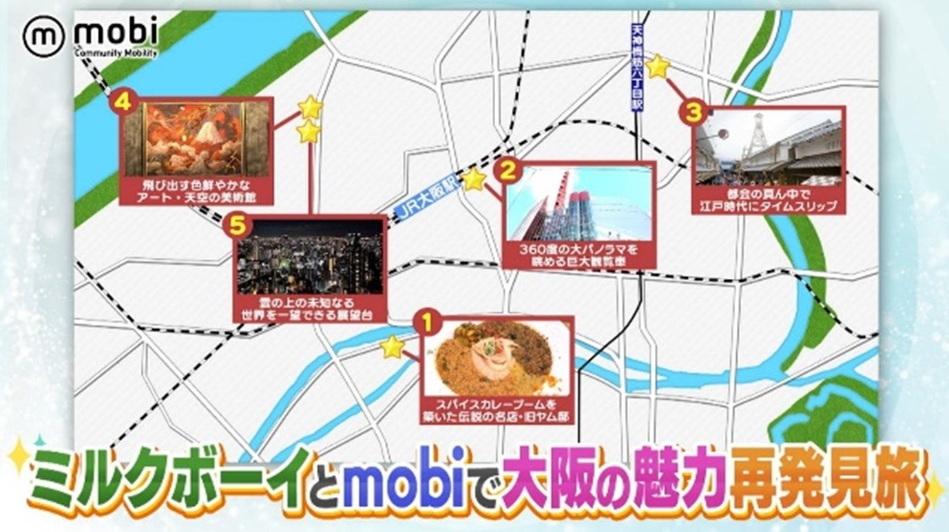 大阪市エリアにおいては、「ミルクボーイ」と大阪市北区住みます芸人である「木尾モデル」が、大阪の魅力を再発見するためにmobiでさまざまなスポットを巡った様子をYouTubeの吉本興業チャンネルで公開中です。大阪府住みます芸人の「span!」が、期間限定のオリジナルラッピング車両に乗り込み、普段mobiを利用されている方々と触れ合う様子が、BSよしもとの「キクテレミルラジ265」で12月21日(木)に放送予定です。