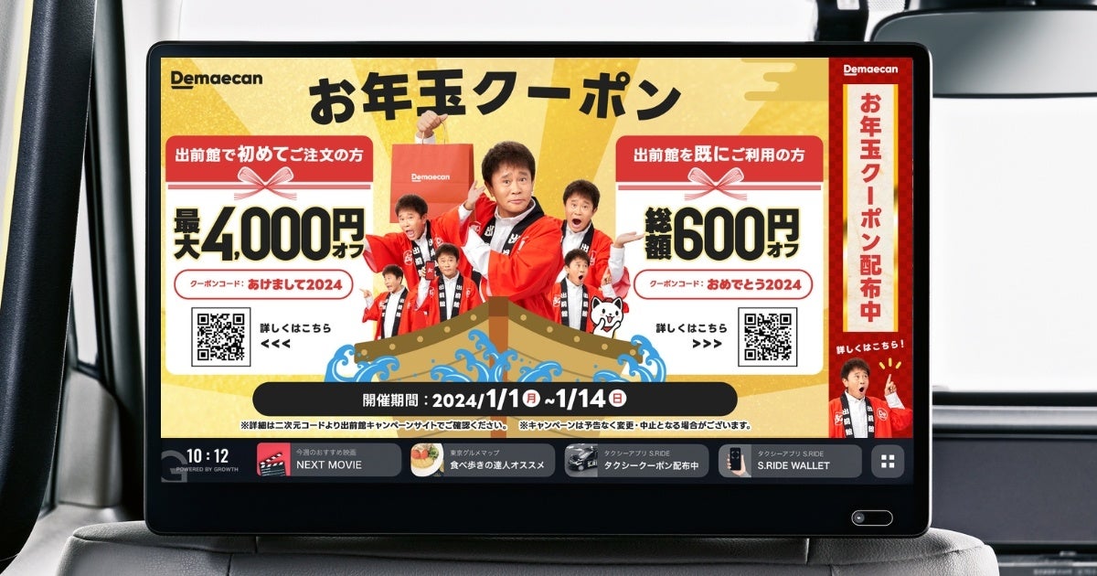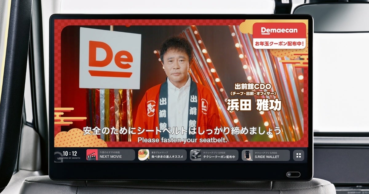元旦からタクシーサイネージメディア「GROWTH」と連携した都内11,500台のタクシーにて放映されるシートベルト着用啓発動画では、ダウンタウン・浜田雅功さんが出前館のCDOとして登場し、タクシー利用者のみなさまへシートベルトの着用を呼びかけます。その他、車内サイネージより出前館が開催する「2024お年玉クーポンキャンペーン」のお知らせなど、お得な情報をご覧いただけます。
