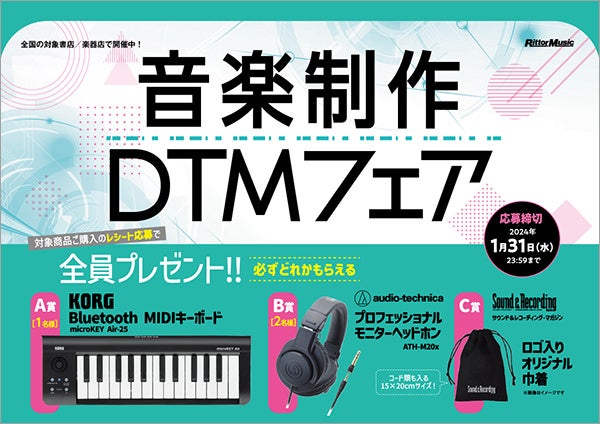 インプレスグループで音楽関連のメディア事業を手掛ける株式会社リットーミュージック(本社:東京都千代田区、代表取締役社長:松本大輔)は、全国の対象楽器店、書店にて『音楽制作DTMフェア』をスタートしました。本フェアでは、対象商品ご購入+レシート応募で素敵なプレゼントが必ず当たるキャンペーンを実施。パソコンやスマホで音楽を作りたい!作曲をしてみたい!そんな皆様を応援する音楽制作フェアとなっております。
